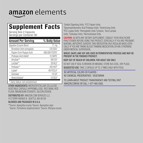 Amazon Elements Digestive Enzyme Complex, Vegetarian, Supports Healthy Digestion, 180 Capsules (Previously Revly)