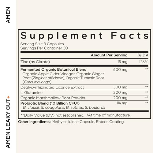 Amen Leaky Gut Supplement – Advanced Formula with Bioavailable L Glutamine, Zinc, Turmeric, DGL Licorice Root – Marshmallow Root – Probiotics & Fermented Prebiotics – Vegan, Non-GMO – 90 Capsules