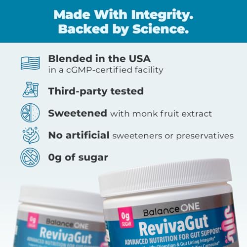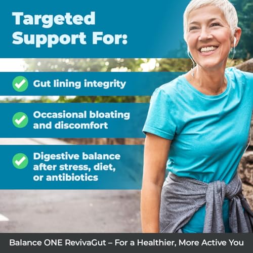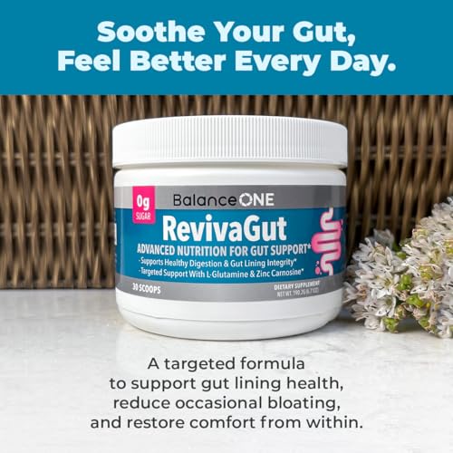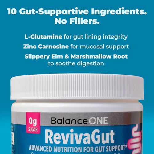 Balance ONE RevivaGut – Gut Lining & Digestive Support Powder – L-Glutamine, Zinc Carnosine, DGL Licorice, Slippery Elm – Leaky Gut Support, Bloating Relief – Non-GMO, 30 Servings