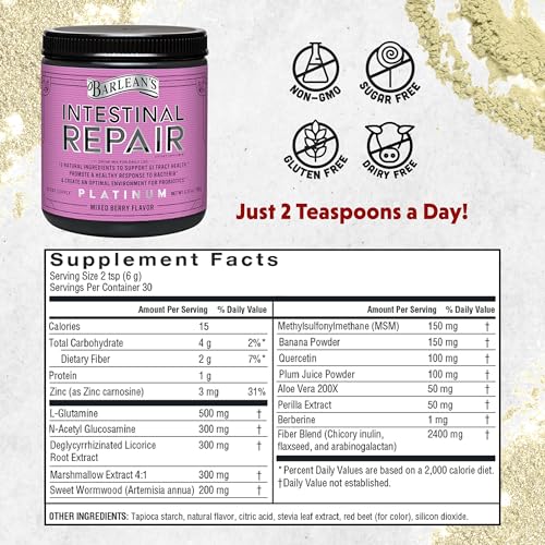 Barlean’s Intestinal Repair Gut Health Powder with 16 Digestive Supplements, L-Glutamine, Marshmallow and Licorice Root, Aloe Vera, and Fiber Mixed Berry Flavor, 6.35 oz