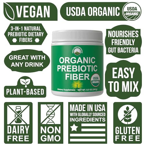Don’t be fooled! Not all fibers are the same. Many fiber supplements on the market contain cheap, non-organic, insoluble “bulking” fibers. Performance USDA Organic Prebiotic Fiber is an all plant-based vegan soluble powder supplement that blends with water in the gut. Helps prevent leaky gut and speeds the passage of food and waste through your gut. Great for men and women.