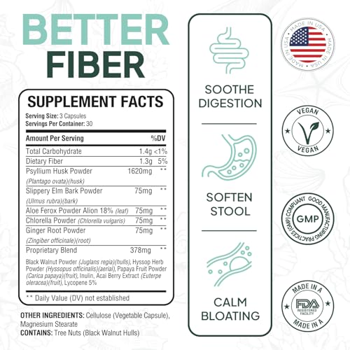 Organics Ocean Better Fiber – Daily Fiber Supplement – Soften Stool for Effortless Bowel Movements – with Psyllium Hulk and Slippery Elm – 90 Capsules