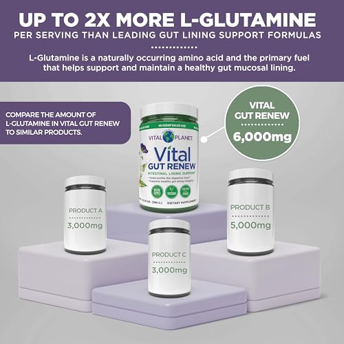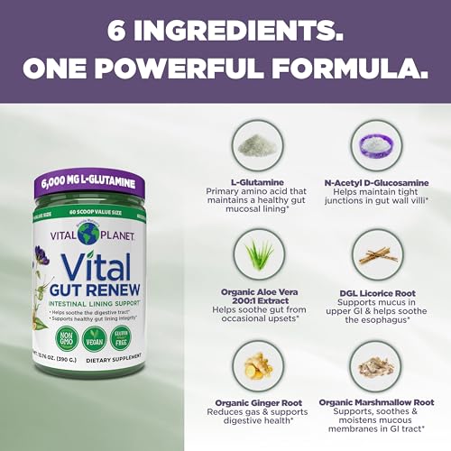 Advanced Leaky Gut Support – Vital Gut Renew is an advanced formula to support leaky gut repair, promote healthy gut lining integrity, and help soothe the digestive tract. Expertly formulated, it contains key ingredients known to support gut lining health: 6,000 mg L-Glutamine, up to 2x more than leading gut lining support formulas, Organic Aloe Vera, N-Acetyl D-Glucosamine, Organic Marshmallow root, Organic Ginger root, and DGL (Deglycyrrhizinated) Licorice root extracts.*