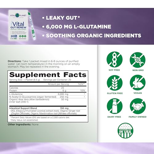 Vital Planet – Vital Gut Renew Powder Supplement for Leaky Gut Repair with L-Glutamine, Marshmallow and Ginger Root, DGL Licorice Root and Organic Aloe Vera, L Glutamine 6000mg, 20 Single Serve Packs