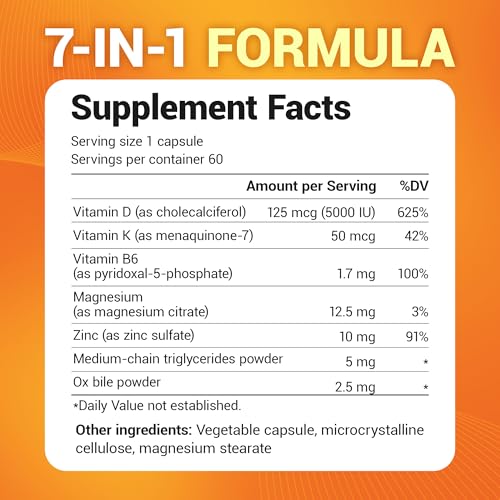 VITAMIN D3 WITH K2– Our vitamin K2 and D3 with magnesium supplement is made up of 5000 IU of vitamin D3 and 50 mcg of vitamin K2. It also includes a unique blend of vitamin B6, zinc, magnesium, MCT oil, and ox bile you won’t find in other formulas – Includes a 60-day supply.